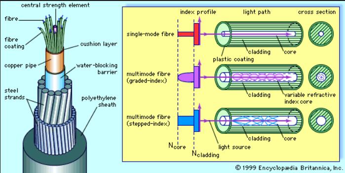 The basic medium of fiber optics is a hair-thin fiber that is sometimes made of plastic but most often of glass. A typical glass optical fiber has a diameter of 125 micrometers (μm), or 0.125 mm (0.005 inch). This is actually the diameter of the cladding, or outer reflecting layer. The core, or inner transmitting cylinder, may have a diameter as small as 10 μm.