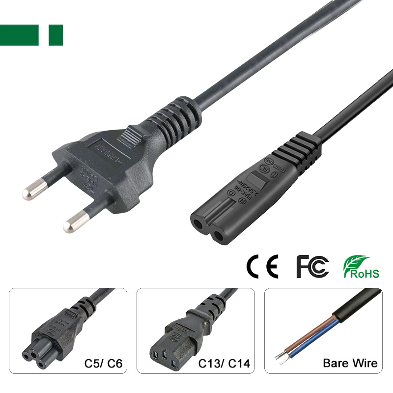 AC Power Cable with EU Type C Plug to C5 Connector. OD: 2*0.75mm², Max. 500W, 1.2M, CCA.
