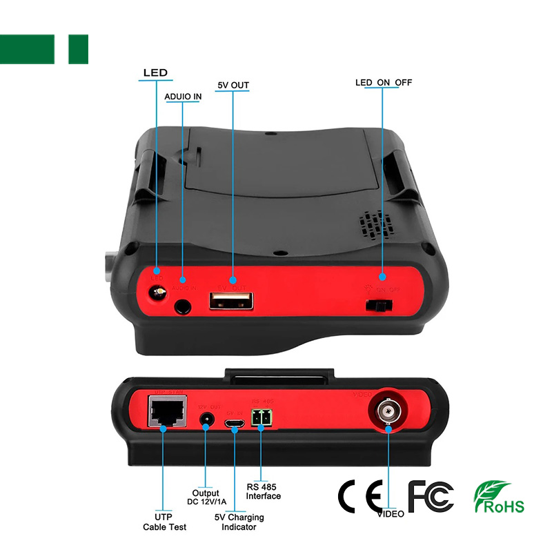 The new HDCCTV Test monitor support "4in1" (AHD/ TVI/ CVI/ CVBS) video format of up to 2MP~8MP resolution. lt also support PTZ control by RS485 and other special features such as DC12V/USB/5V output, audio test, UTP cable test, LED lighting etc. lt is designed to bring installer maximum conveniency during the installation.