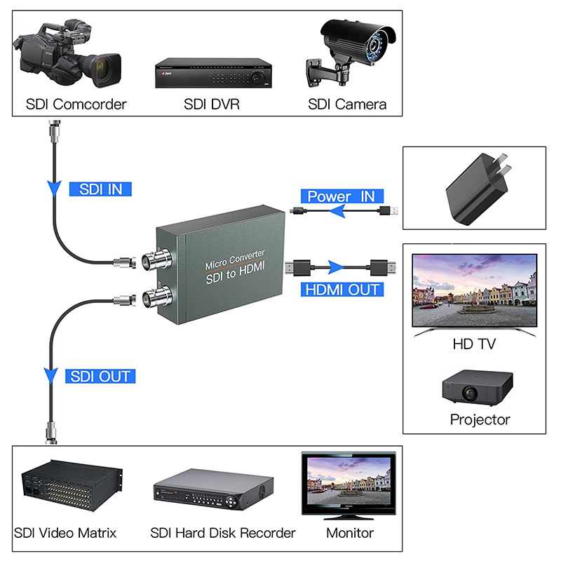 • Product description: The SDI to HDMI converter allows HD-SDI and 3G-SDI signals to be shown on HDMI displays while ensuring high bit rates of 2.97Gbit/s to give you fast signal transmission without any loss.