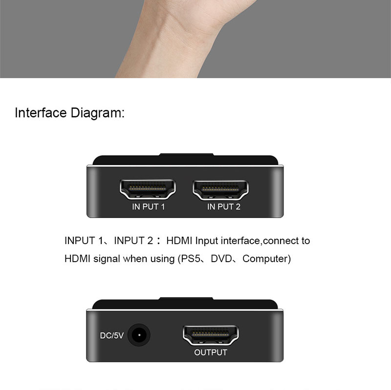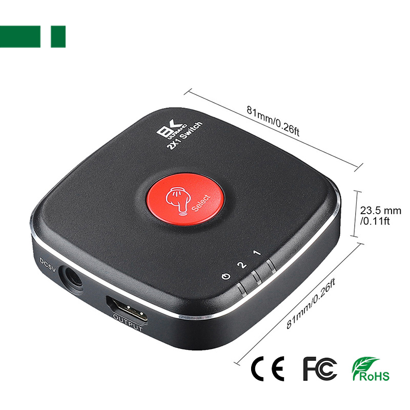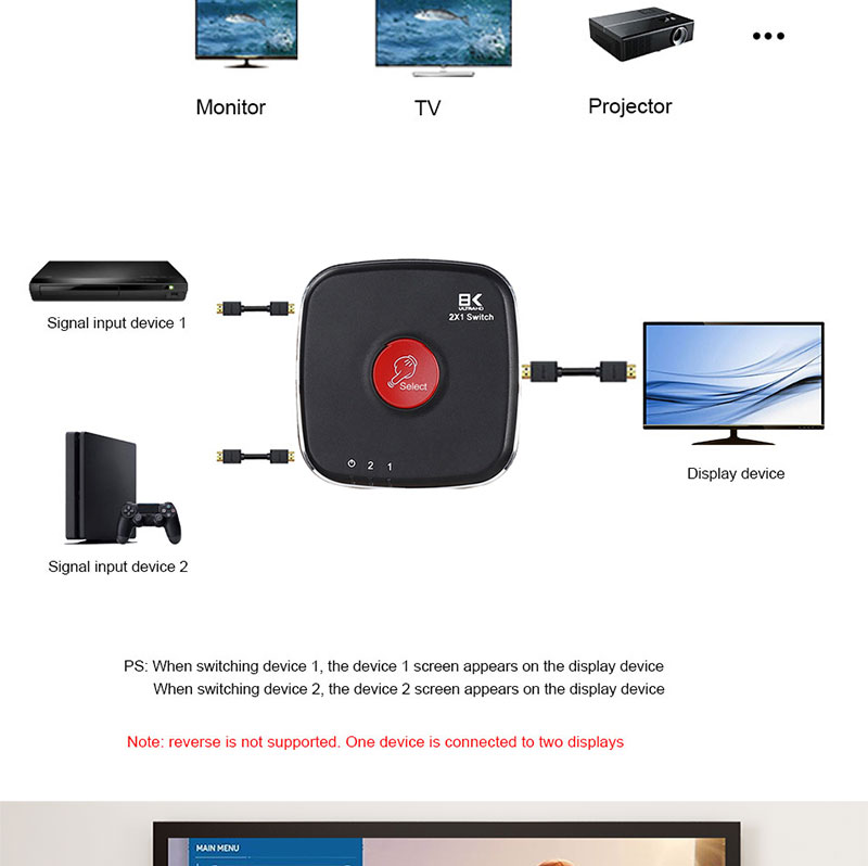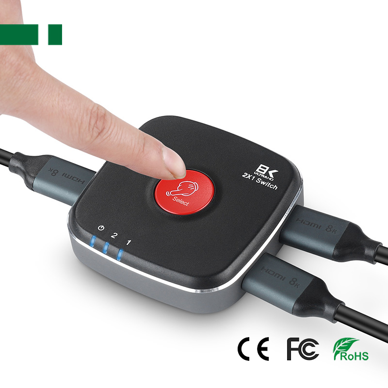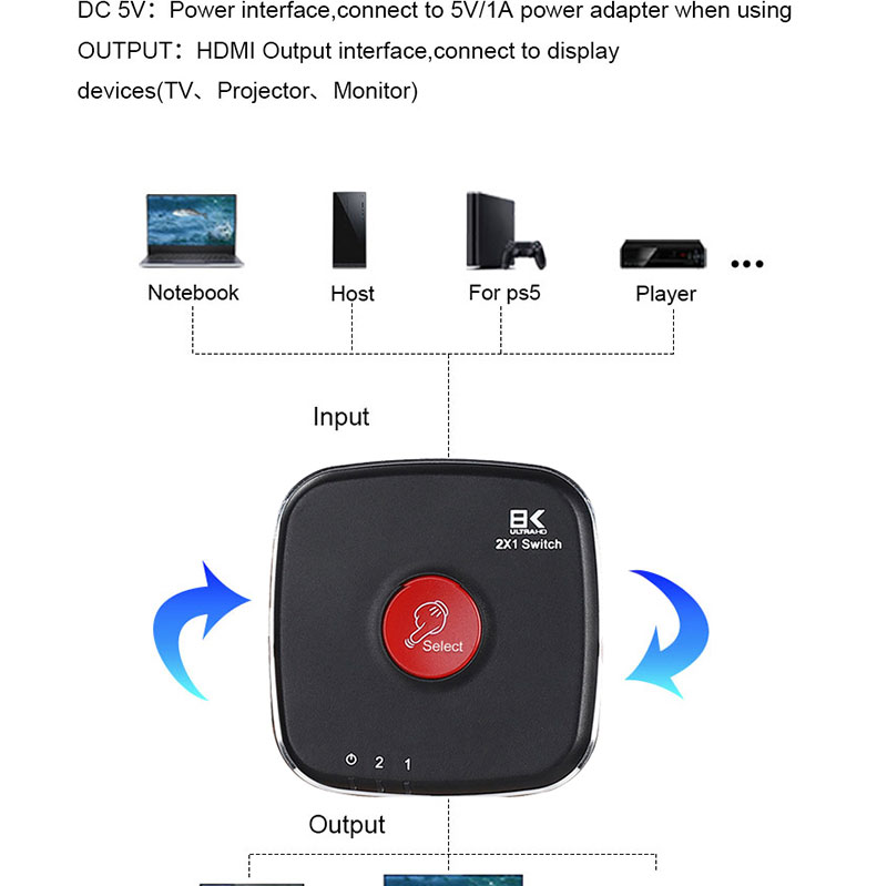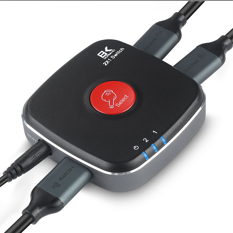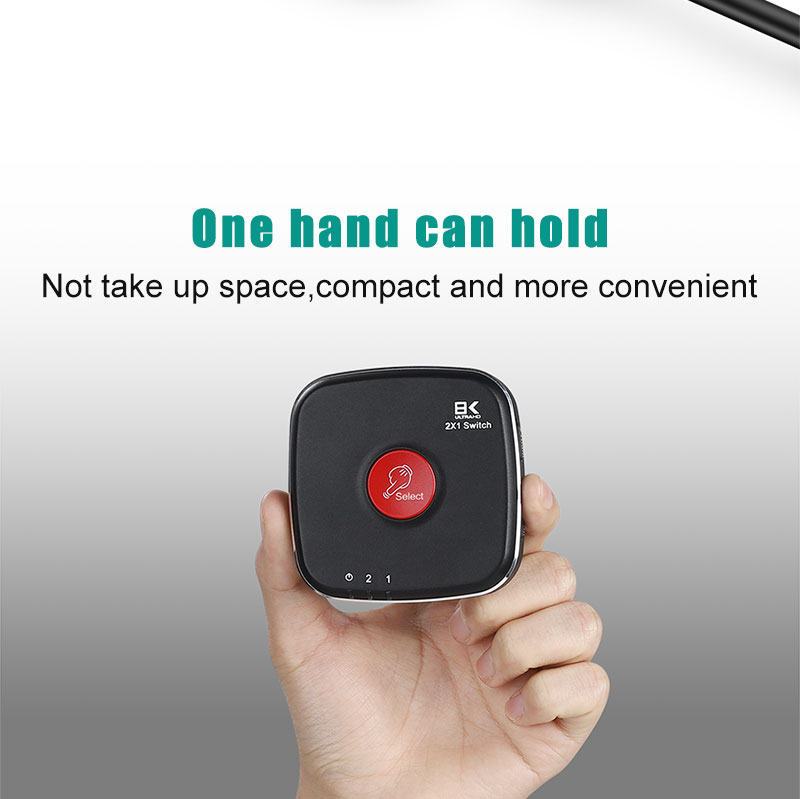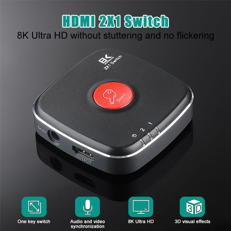 This is 8K HDMI 2X1 Switch.It support 2 HDMI input and 1 HDMI Output.It is ideal for scenarios with two 8K signal sources and an 8K ULTRA HD TV, monitor, or projector.It support fast switching, very used in home theater, home appliance stores, teaching institutions and other places.