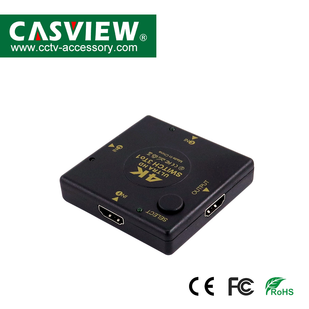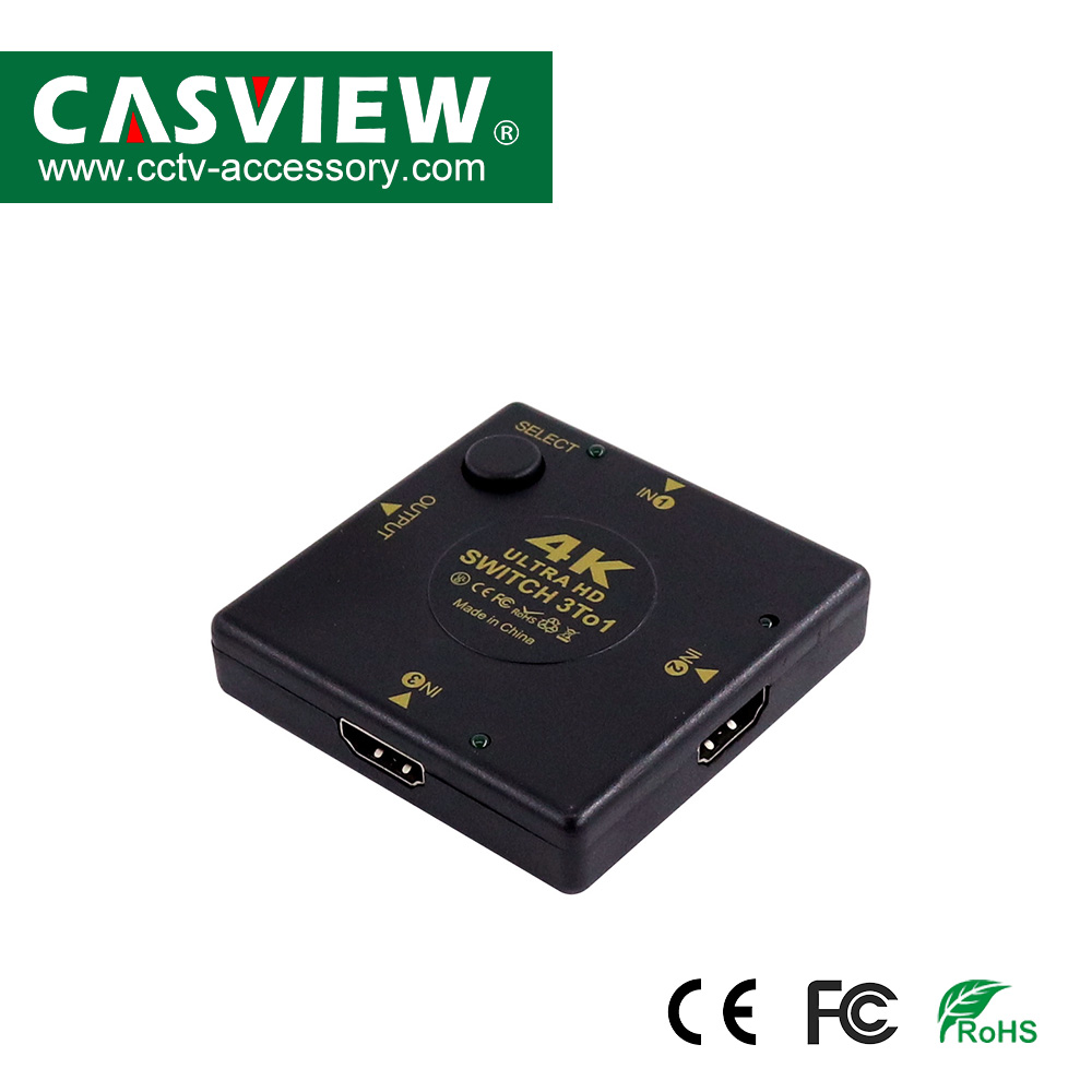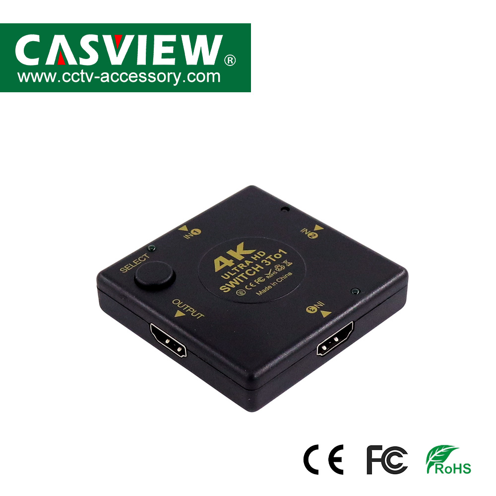 The 3 input to 1 output HDMI Switcher routes high definition 4K*2K video and digital audio from any one of the 3 sources to display unit.