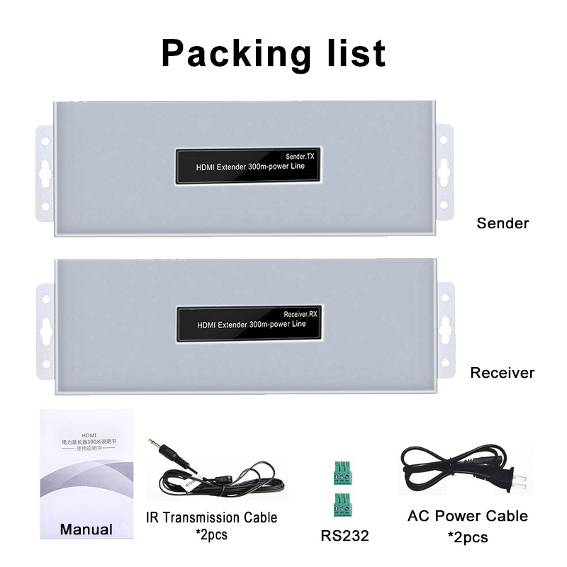 Package Contents: Sender *1pc, Receiver *1pc, Manual *1, AC power line *2pcs, IR transmission cable*2pcs, RS232 * 2pcs
