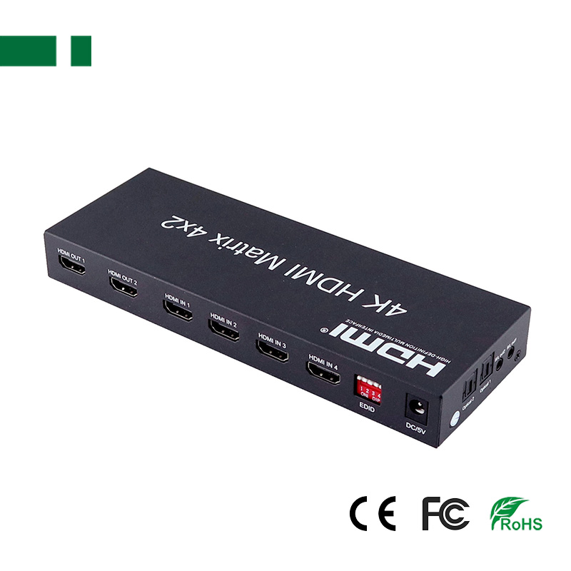 • Product description: The HDMI matrix 4x2 can connect 4 HD signal sources to 2 HD display terminals with optical fiber or stereo headphone output.