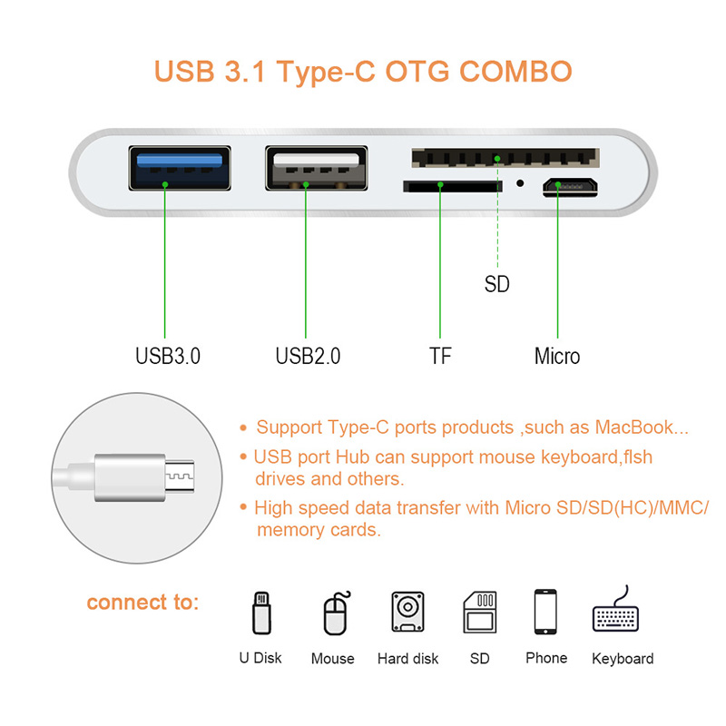 • USB-C to USB3.0 & 2.0+SD+TF+Micro USB Adapter (5 in 1)