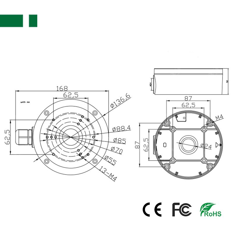 • Product description: Junction Box permits to put the power supply, the cables and the installation accessories inside of it. It has multiple holes for installation of different types of dome and bullet cameras.