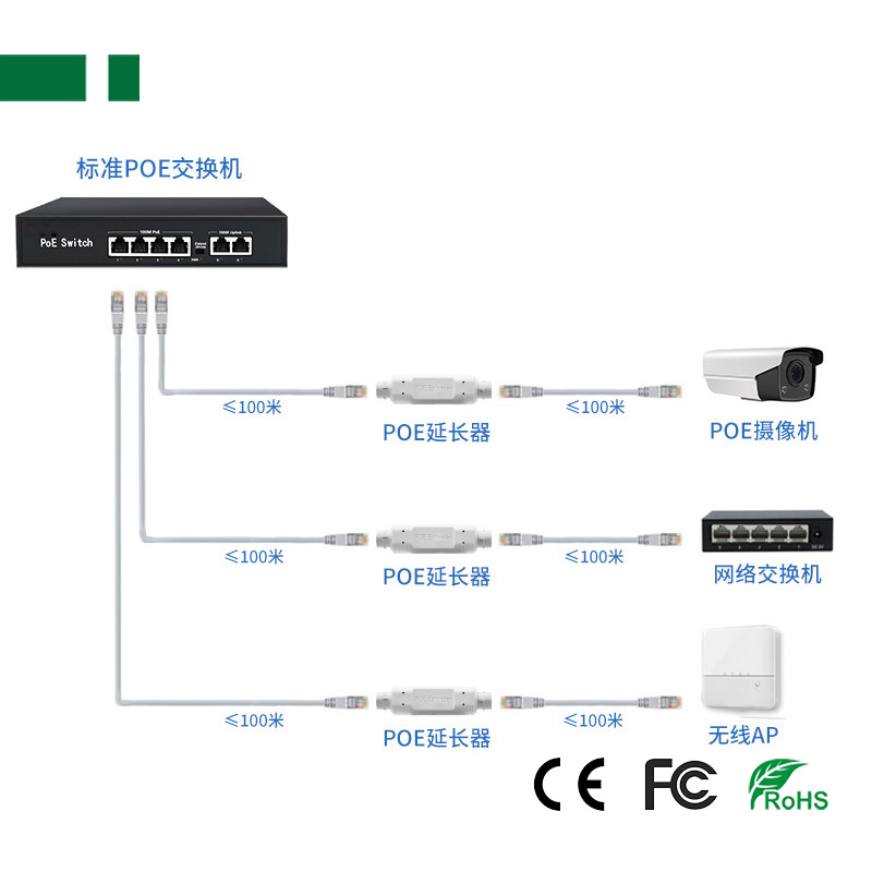 ◇ POE repeater can extend the network signal transmission distance and the POE power supply distance;
