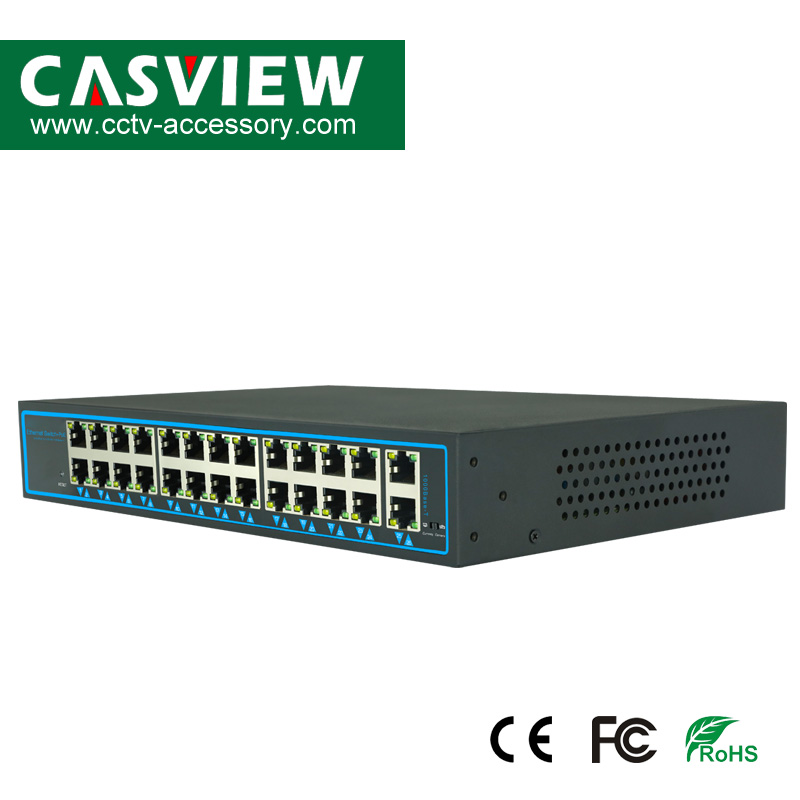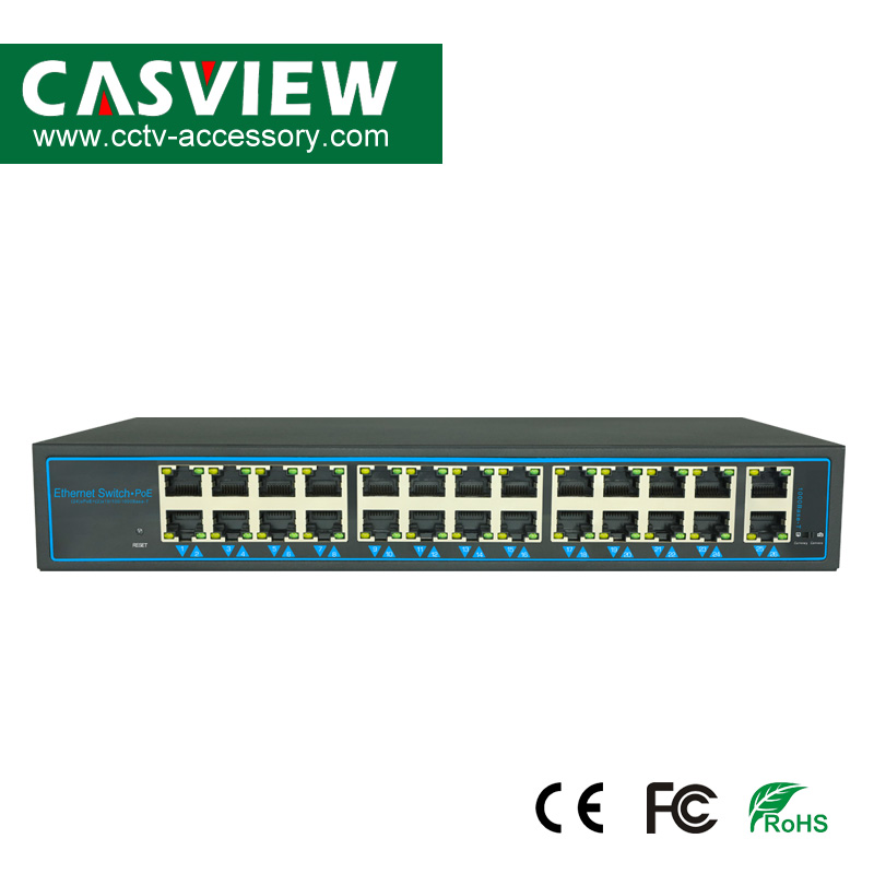 This is a compact 24+2 port POE Switch,With 24 10/100Mbps PoE Switch, and 2ports 10/100/1000Mbps Uplink Ports. The 24 POE ports can automatically detect and provide power for any connected 802.3af Powered Device(PD),such as VOIP phones,IP Cameras, All POE ports support the IEE802.3af standard,with a maximum output of 15.4w each port.