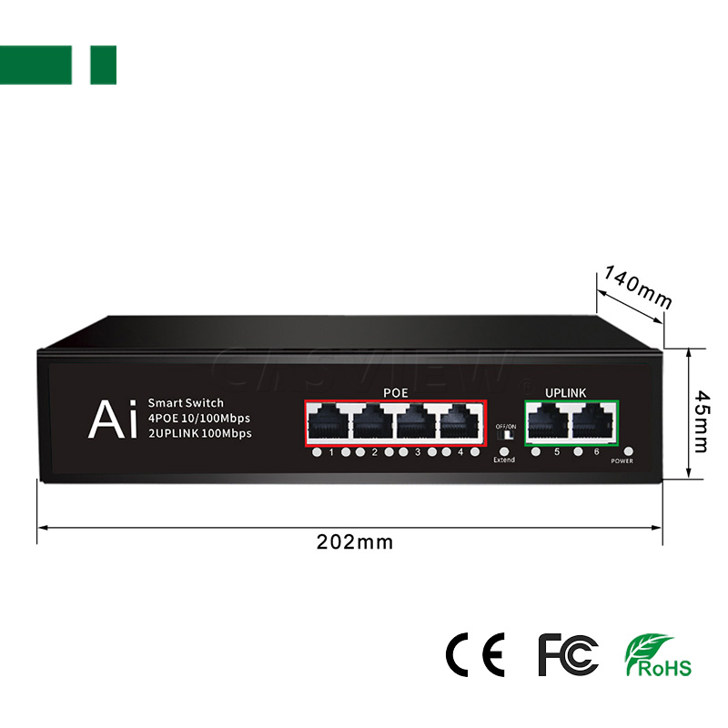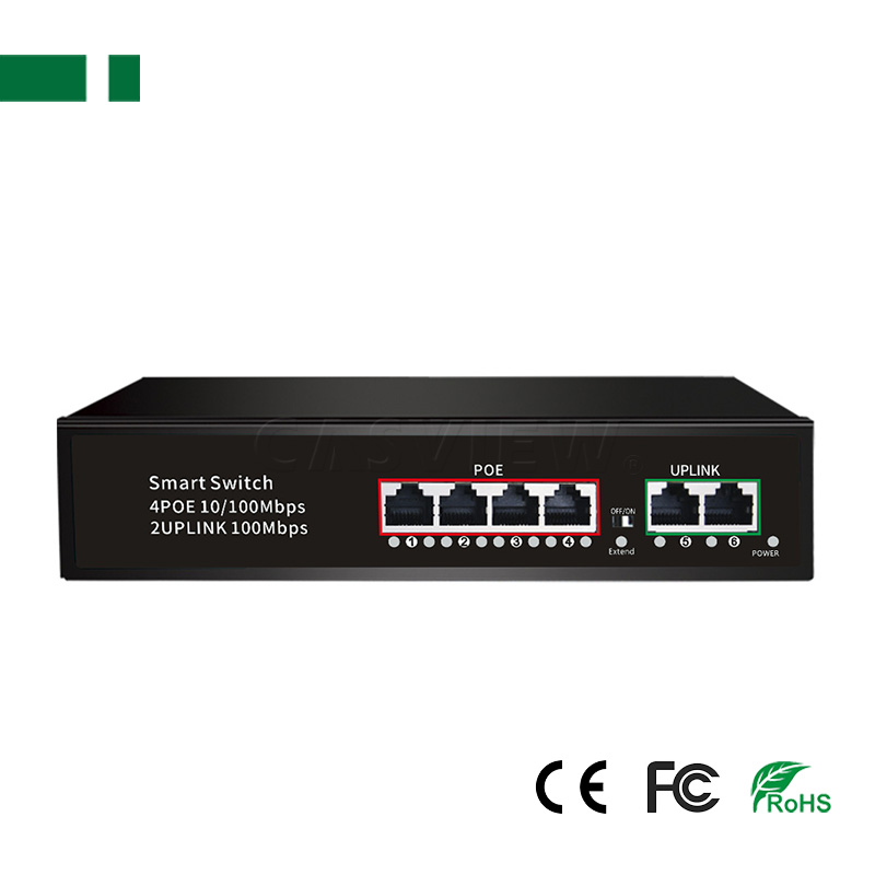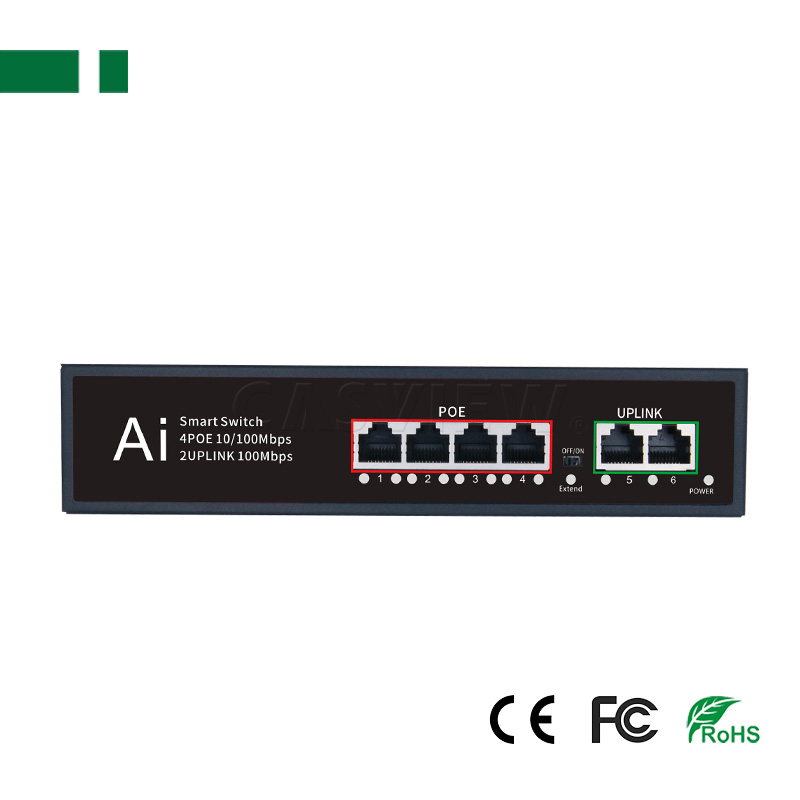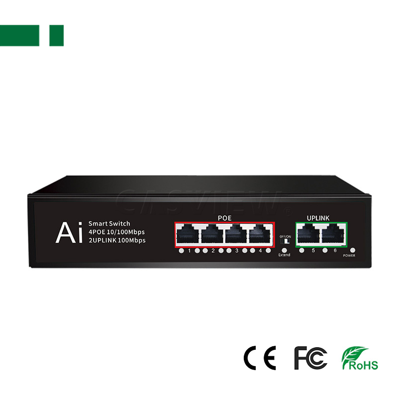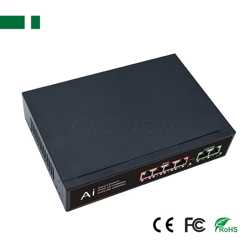 1. 4 ports 10/100Mbps POE Switch with 4 ports PoE ports and 2 uplink ports;