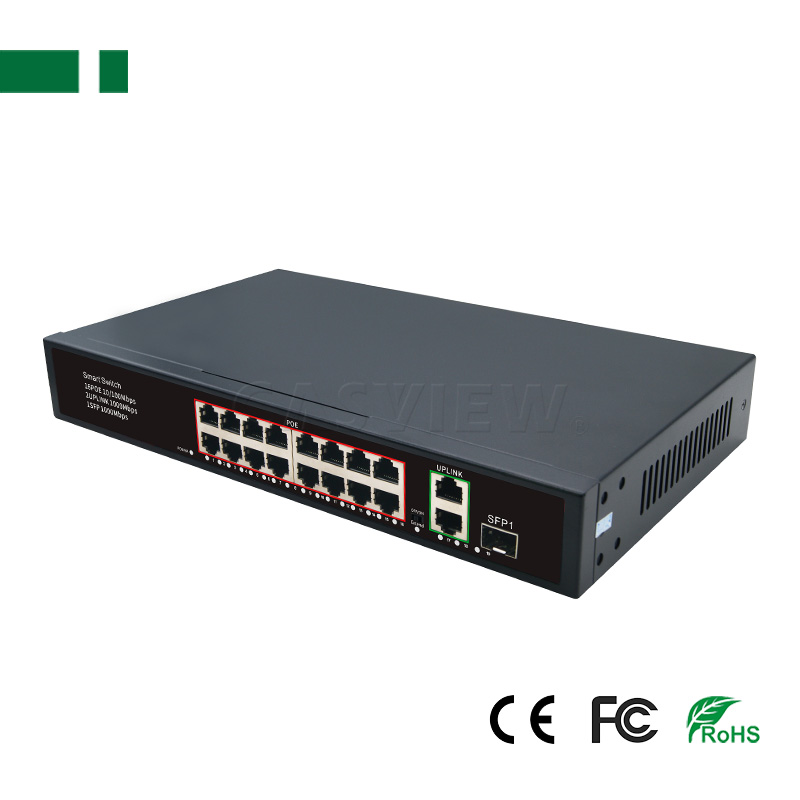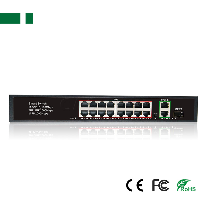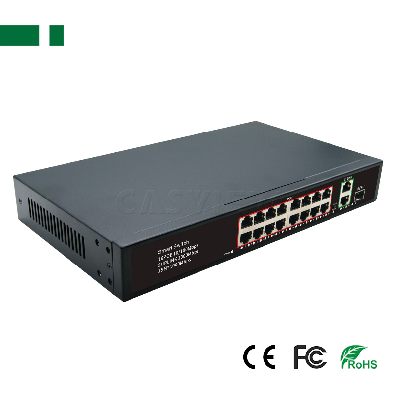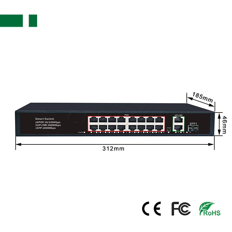 1. 16 ports 10/100Mbps POE Switch with 16 ports PoE ports and 2 uplink ports and 1 SFP port;
