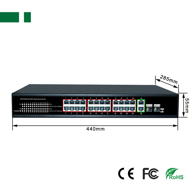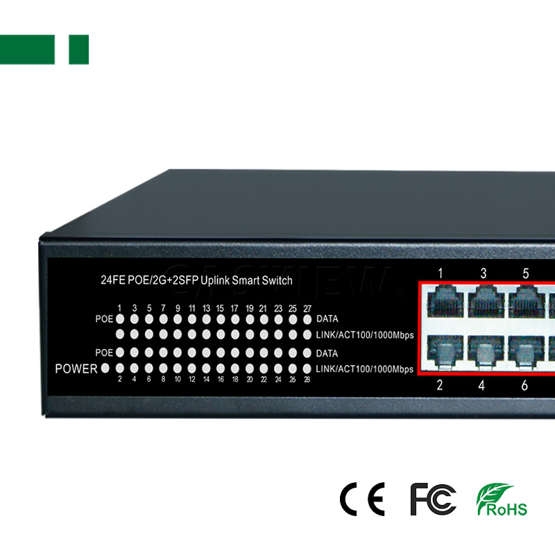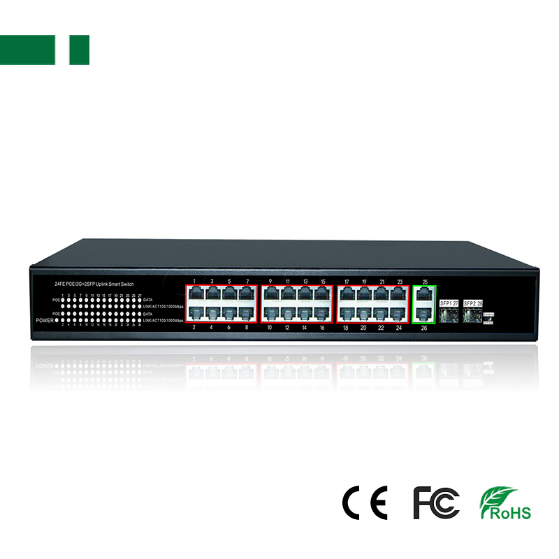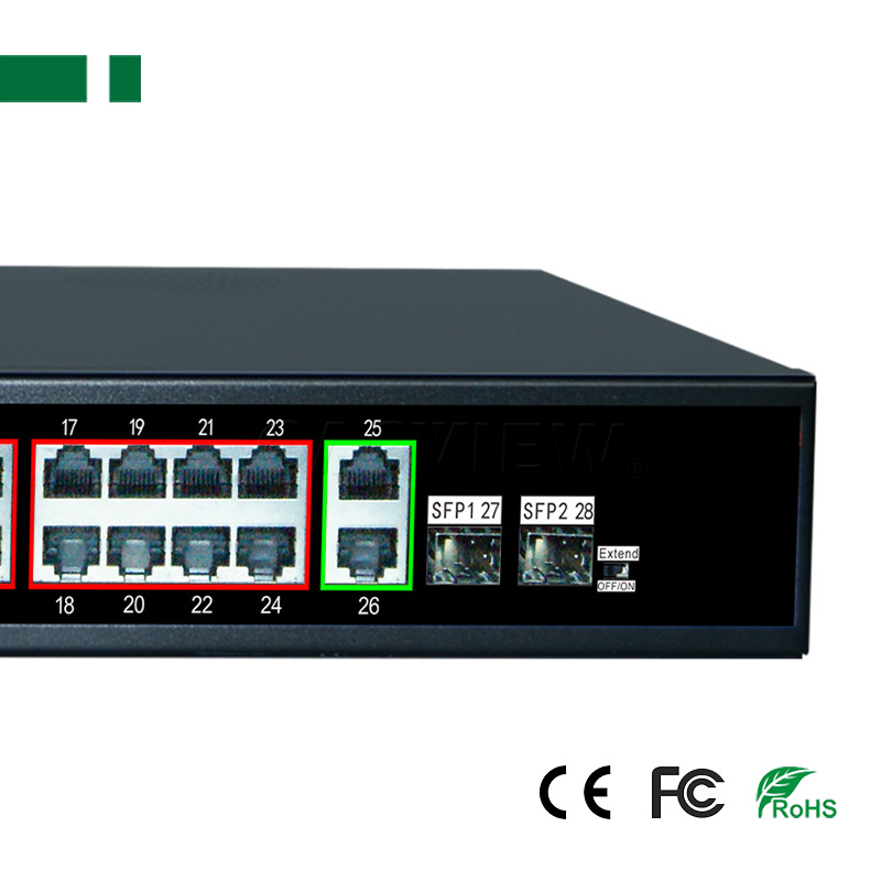 1. 24 ports 10/100Mbps POE Switch with 24 ports PoE ports and 2 uplink ports and 2 SFP port;