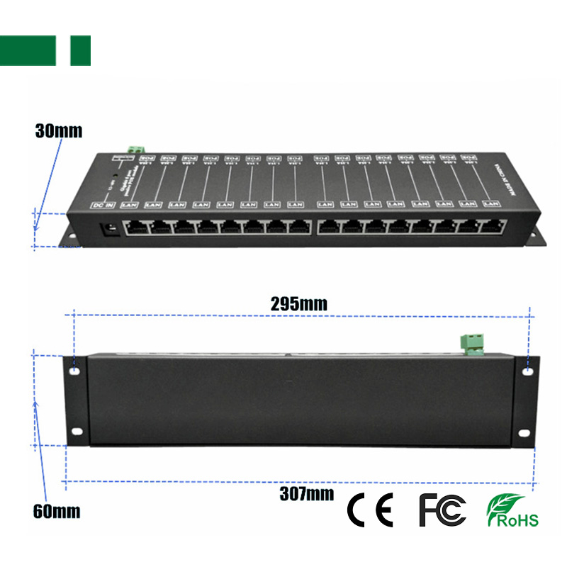 ● Ports: 16* RJ45 (PoE) + 16* RJ45 (LAN) + 1* DC (5.5*2.1mm);
