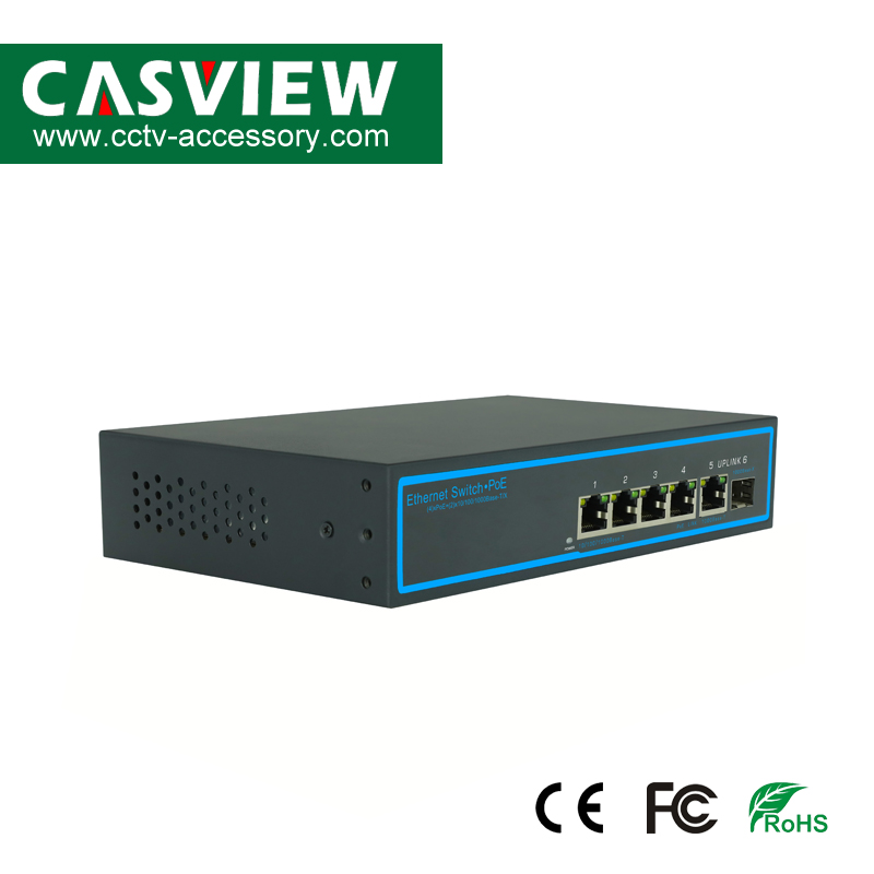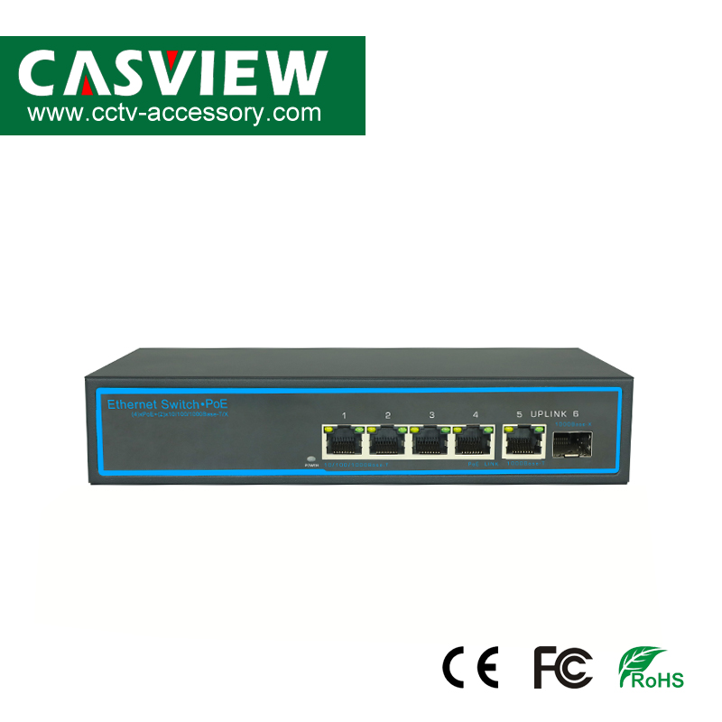4x 10/100/1000Mbps PoE ports, 1x10/100/1000Mbps uplink port, 1*10/100/1000Mbps SFP port;