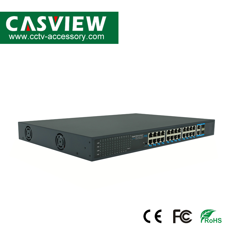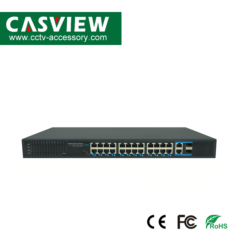 24x 10/100/1000Mbps PoE ports, 2x10/100/1000Mbps uplink port, ;2*10/100/1000Mbps SFP port