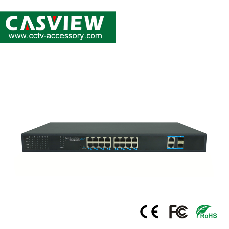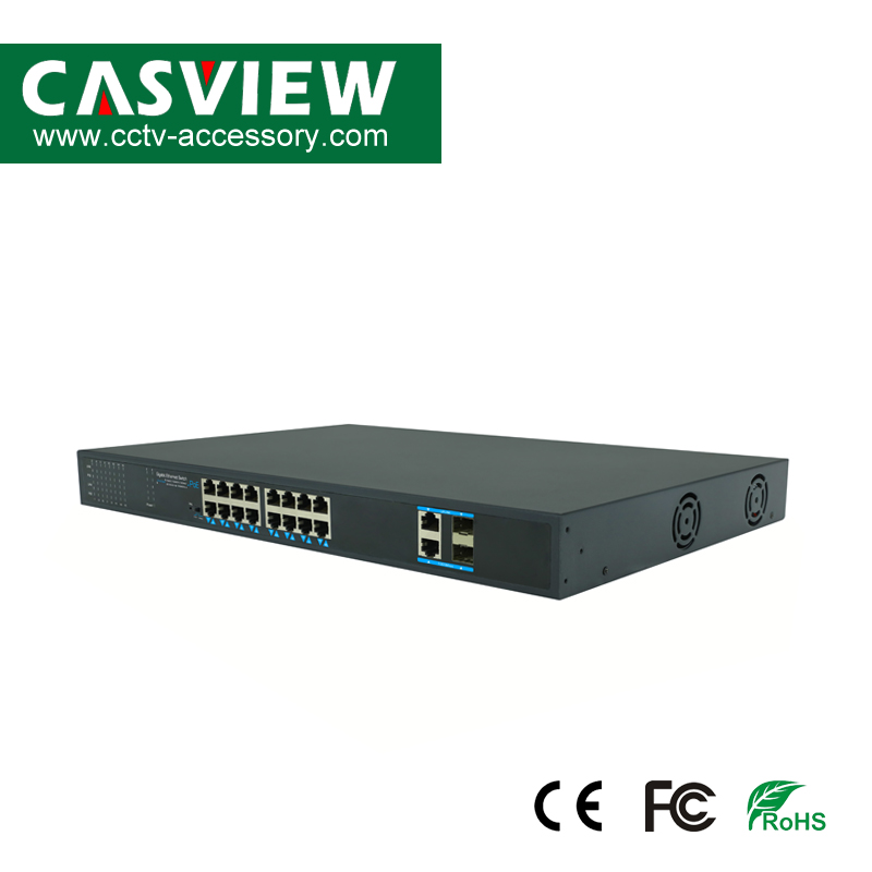 16x 10/100/1000Mbps PoE ports, 2x10/100/1000Mbps uplink port, ;2*10/100/1000Mbps SFP port