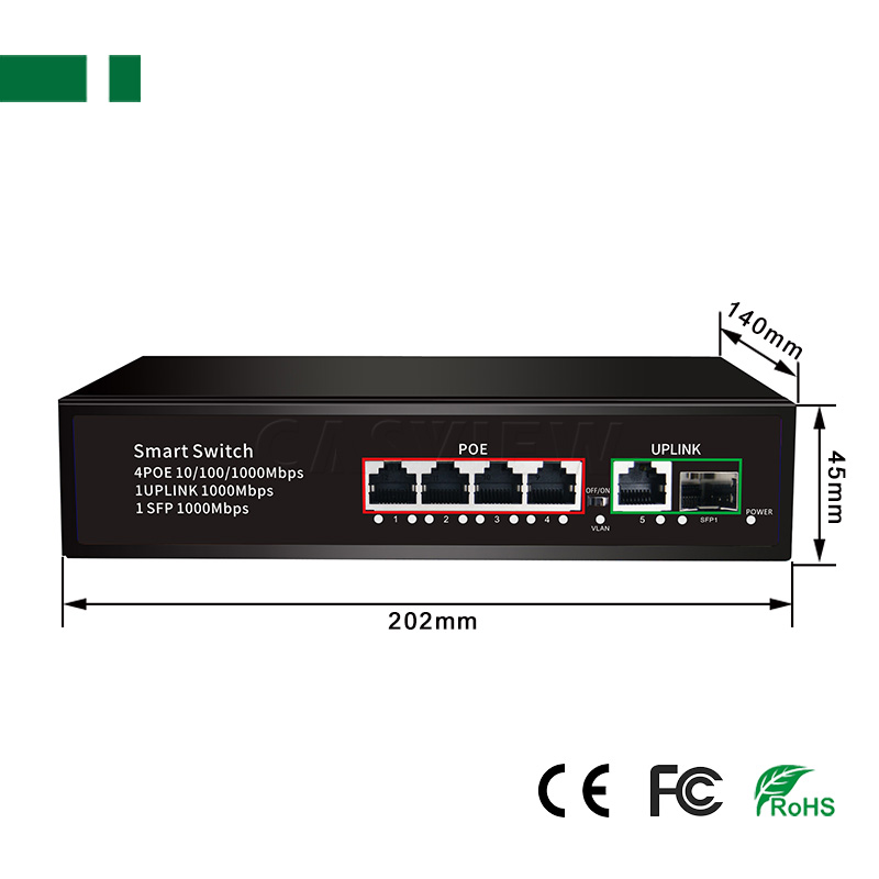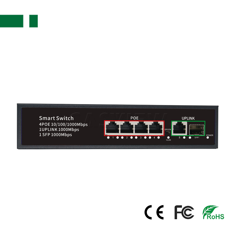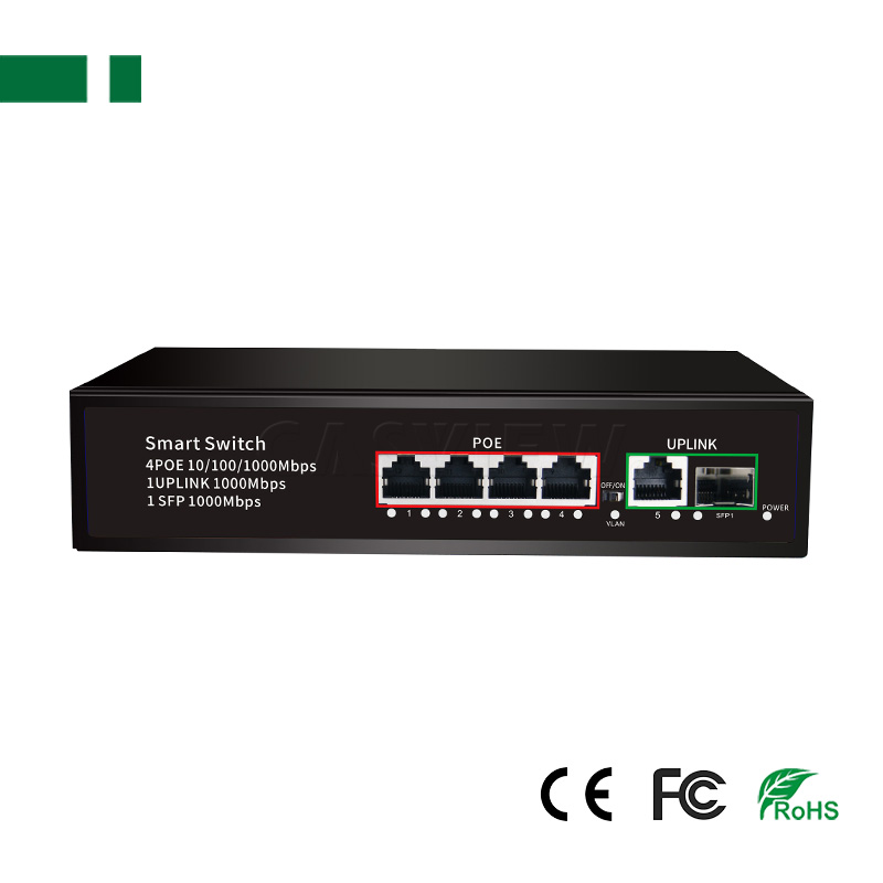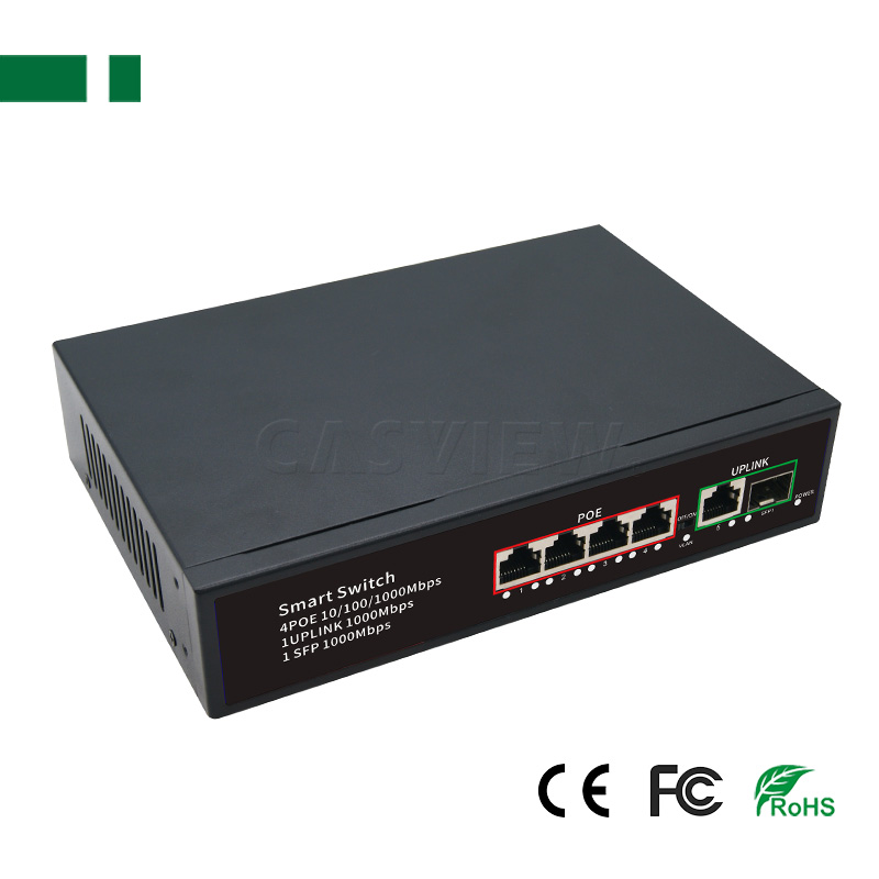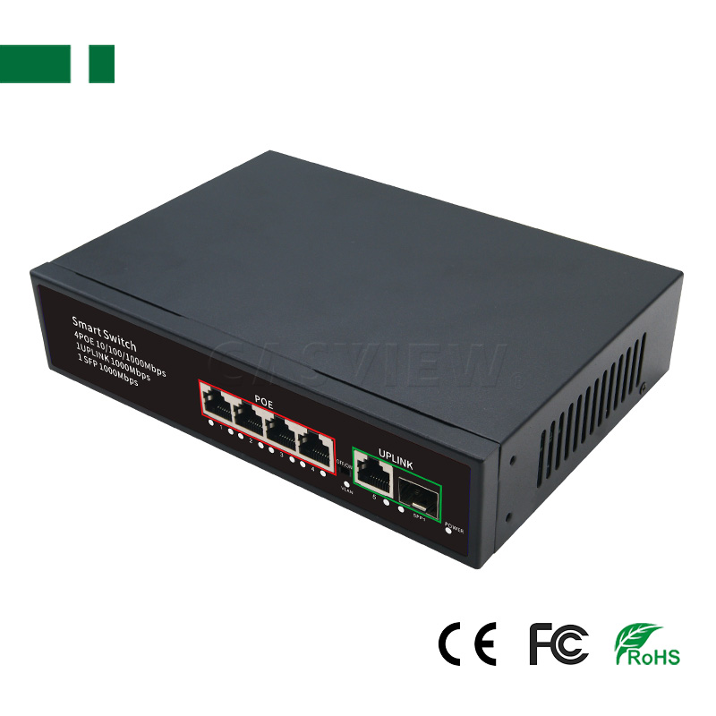 1. 4 ports 10/100/1000Mbps POE Switch with 4 ports PoE ports and 1 uplink port and 1 SFP port;