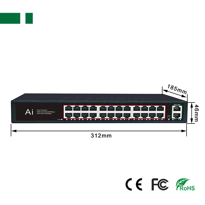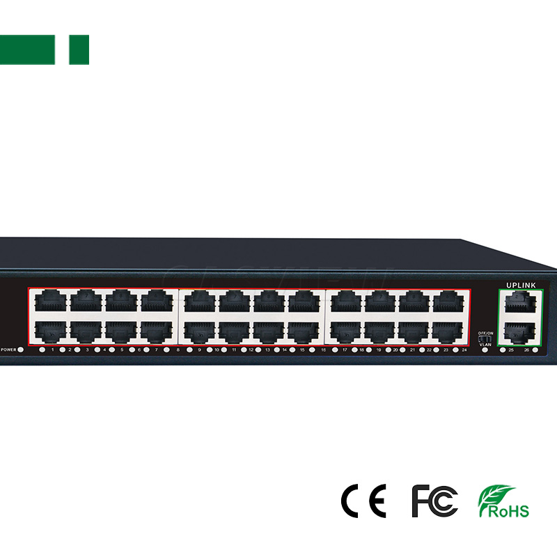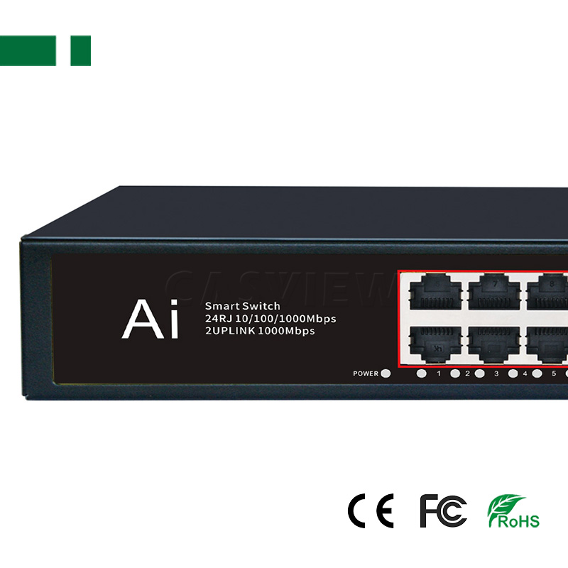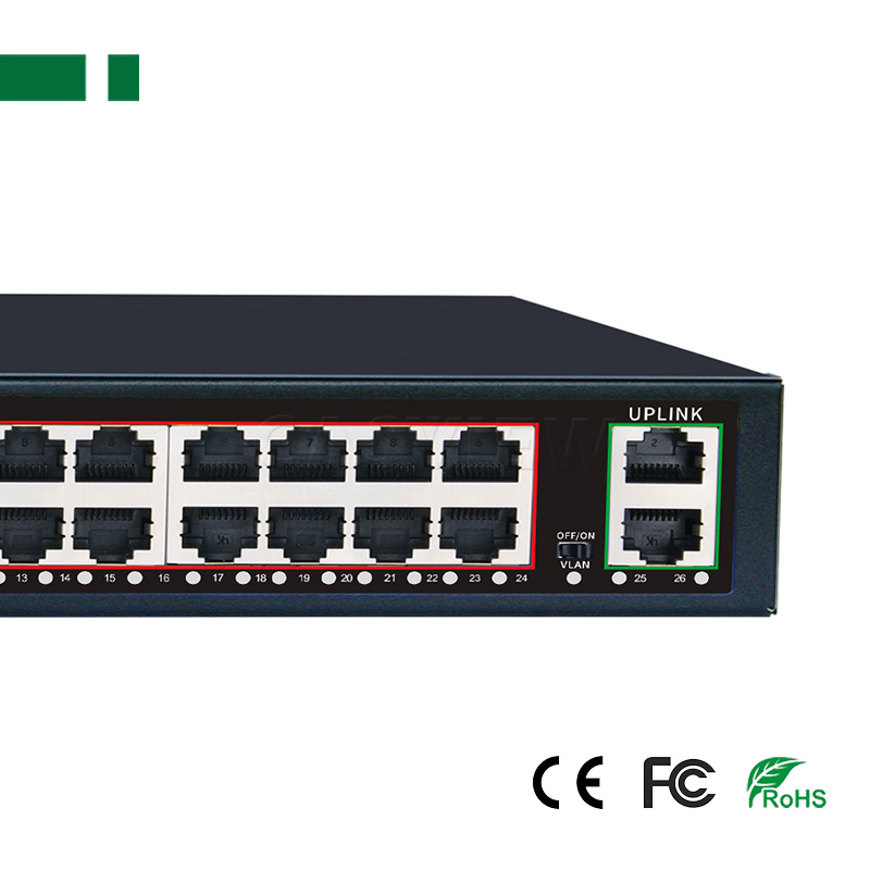 1. 24 ports 10/100/1000Mbps POE Switch with 24 ports PoE ports and 2 Uplink ports;