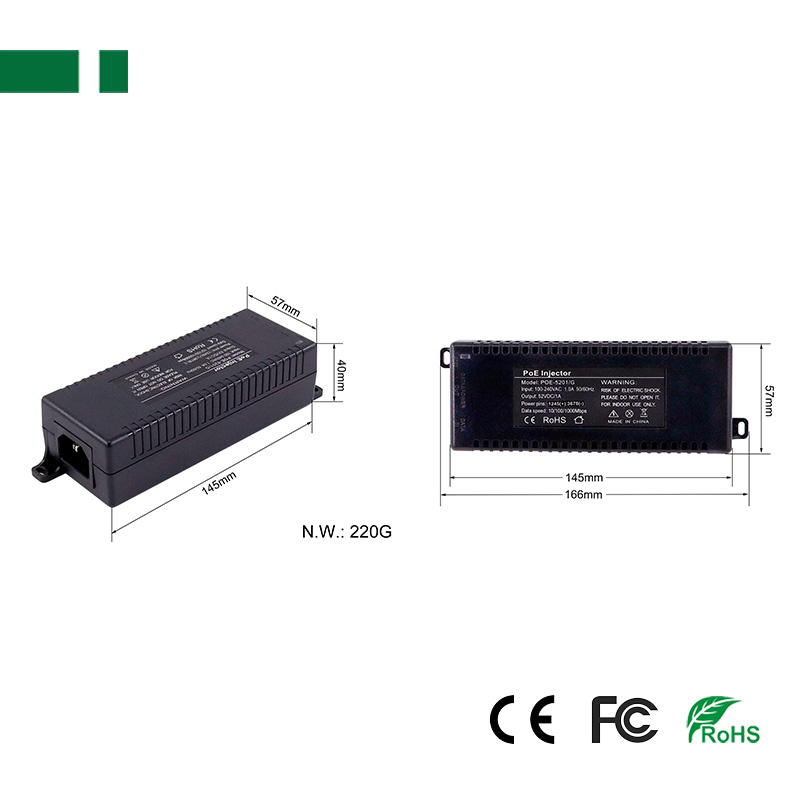 The CPE5201-30W is a Gigabit Power over Ethernet Injector with one Ethernet Input (data only) port and one Output (data + power) port that is designed for small or medium network environments. The CPE5201-30W supplies remote power for new applications such as wireless access points, pan-tilt-zoom (PTZ) IP cameras and video phones.