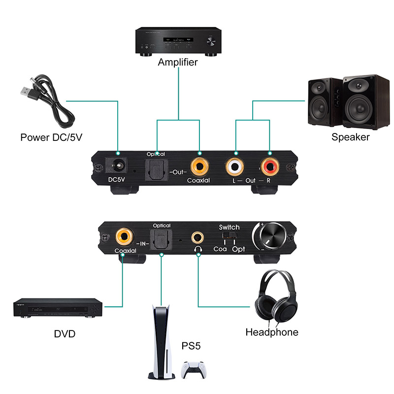 This DAC support 1 optical digital audio and 1 coaxial digital audio signal input,it could be switched through the button.It supports 1 optical digital audio loop out and 1 coaxial digital audio loop out,it could connect two sets of stereo system.At the same time, high-quality analog stereo is output through the internal decoder of the product. The product is also designed with a volume knob, which can flexibly control the output analog volume.