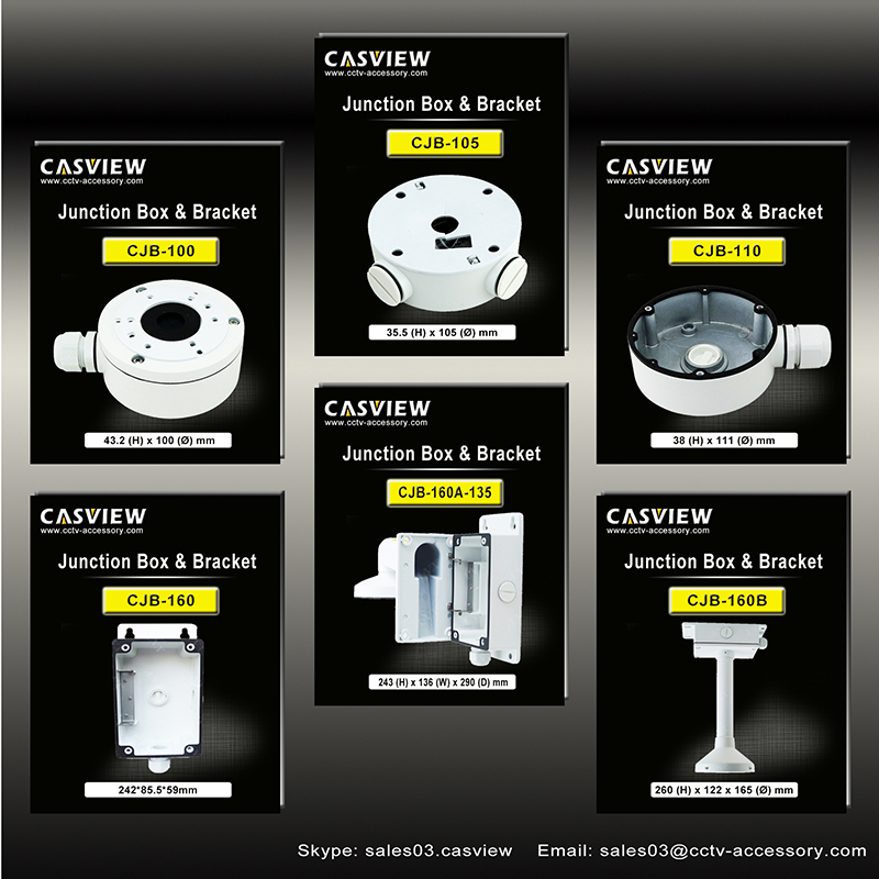 For the installation of network camera or camera Housing & enclosure in video security projects, CASVIEW is offering a variety of mounting brackets like wall mount bracket, pole mount bracket, corner mount bracket together with accessories like universal joint, clamps.