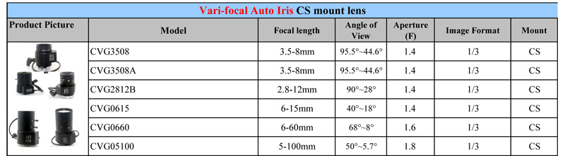 • Product description: Vari-focal Auto Iris CS mount lens